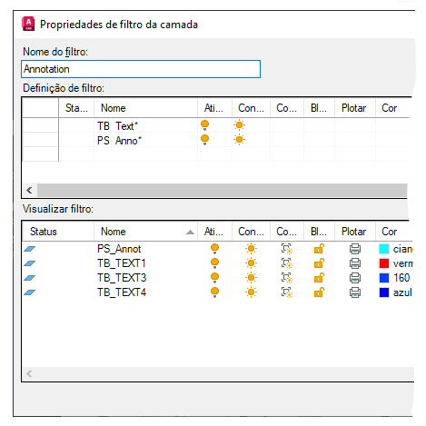 É possível salvar vários filtros de camada em um desenho, mas somente um filtro de camada pode ser aplicado de cada vez.