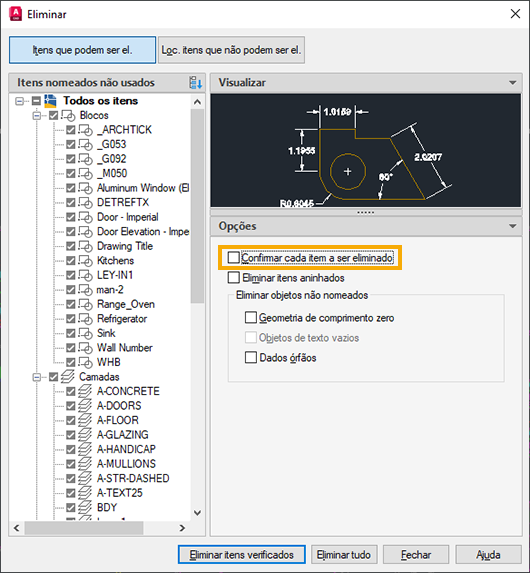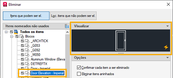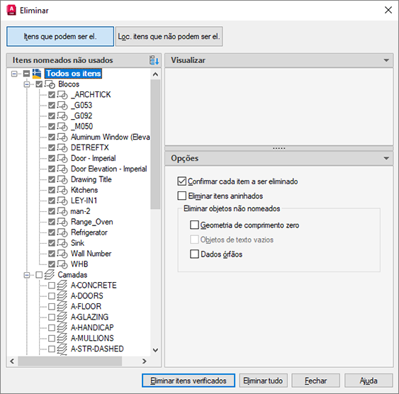 O recurso Eliminar remove do desenho itens não usados ou objetos nomeados, como definições de bloco e camadas.