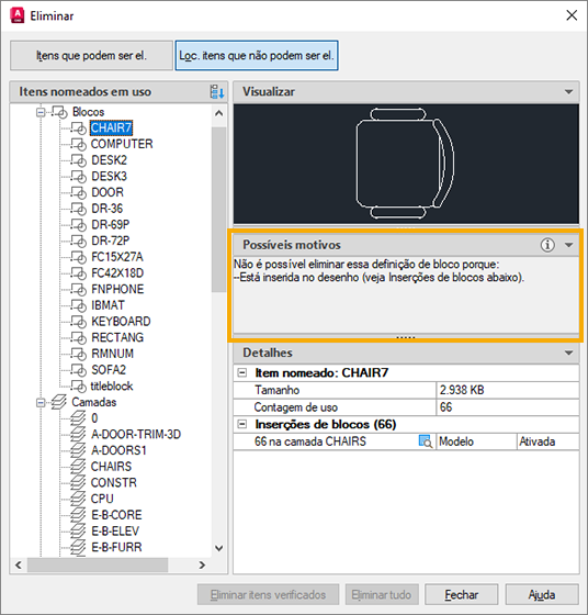 Talvez haja um item que você gostaria de eliminar, mas ele não está aparecendo na lista Itens nomeados não usados. Use a lista Localizar itens que não podem ser eliminados para visualizar os itens nomeados em uso no desenho.