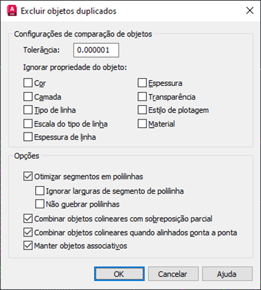 Por padrão, o comando OVERKILL não atua em objetos que têm propriedades diferentes. Por exemplo, se os objetos forem idênticos, mas estiverem em uma camada diferente ou tiverem uma espessura de linha diferente, esses objetos não serão tratados como duplicados. No entanto, é possível alterar as configurações para ignorar determinadas propriedades.
