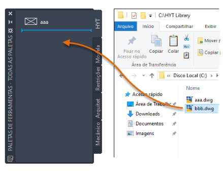 Abra a pasta Biblioteca HYT no Explorador de arquivos. Em seguida, arraste os dois arquivos de desenho para a paleta HYT.