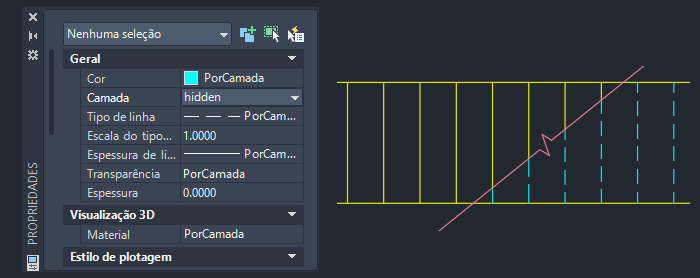 Usando uma janela de interseção, selecione as seis linhas à direita da linha de quebra e altere a camada para oculta.