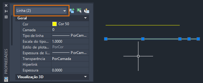 Você verá Linha (2) exibida na lista suspensa Tipo de objeto na parte superior da paleta Propriedades.