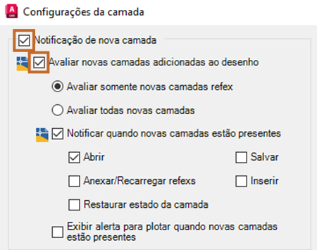 Cada opção indica quando a notificação será exibida. Portanto, se Abrir estiver selecionado e uma nova camada estiver presente, uma notificação será exibida quando você abrir o desenho. Se Salvar estiver selecionado e houver uma nova camada, uma notificação será exibida cada vez que você salvar.