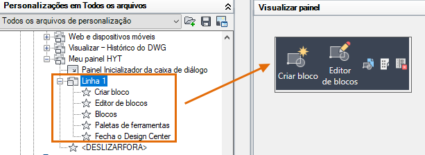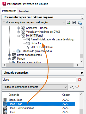 No painel Lista de comandos, na caixa de texto Pesquisar a lista de comandos, digite bloco. Selecione Criar bloco (comando BLOCO) e arraste-o para a Linha 1 abaixo de Meu painel HYT.