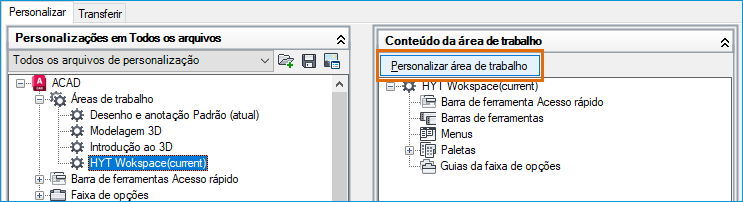 Selecione o espaço de trabalho atual e clique em Personalizar espaço de trabalho no painel Conteúdo do espaço de trabalho.