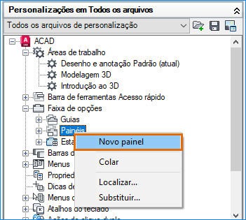 No nó da faixa de opções, clique no sinal de mais (+) ao lado do nó Painéis para expandi-lo.