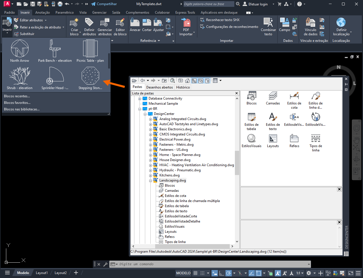 Os estilos nomeados, os blocos e as configurações de desenho definidos no Landscaping.dwg agora estão disponíveis em MyTemplate.