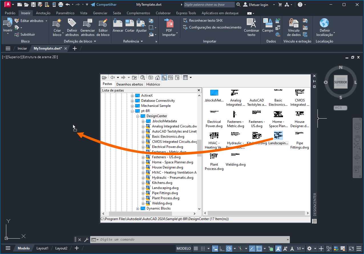 É possível usar o DesignCenter para adicionar camadas, estilos nomeados e blocos a um modelo.