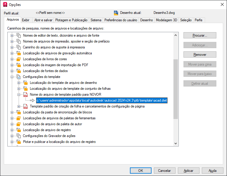 Agora que você tem um modelo criado e salvo, vamos começar a usá-lo. Por padrão, quando você inicia um novo desenho, o AutoCAD cria o desenho com base no modelo especificado no Nome do arquivo de modelo padrão para NOVOR, neste caso, acad.dwt. Vamos alterar essa configuração para iniciar um novo desenho usando o novo modelo.