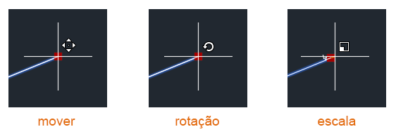 Nota: Os sinais de cursor indicam quando você está nos modos mover, rotacionar ou dimensionar das alças, mas não nos modos esticar ou espelhar.