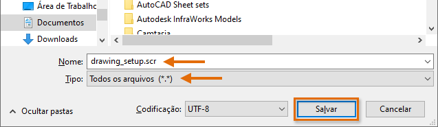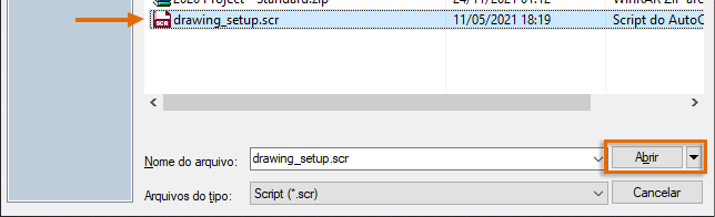 Na caixa de texto Nome do arquivo, selecione o texto padrão e digite drawing_setup.scr.