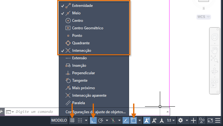 Define os snaps ao objeto em execução como Ponto final, Ponto central e Intersecção