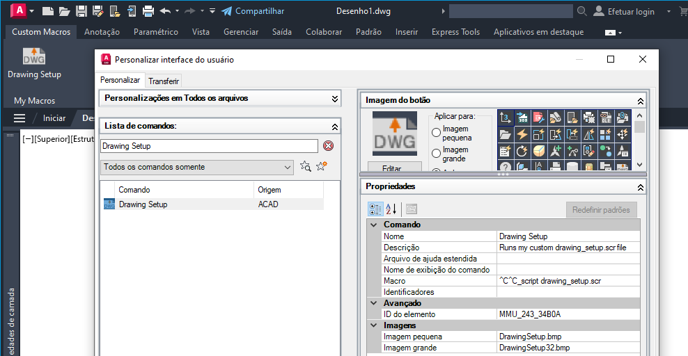 É possível definir uma macro com o comando SCRIPT para executar um script específico em um botão da faixa de opções. Em seguida, veja a aparência de uma macro que inicia o comando SCRIPT e executa um arquivo de script denominado drawing_setup.scr: