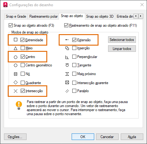 Por exemplo, a variável de sistema OSMODE permite que você defina vários snaps ao objeto (osnaps) em execução. Estas são as opções disponíveis: