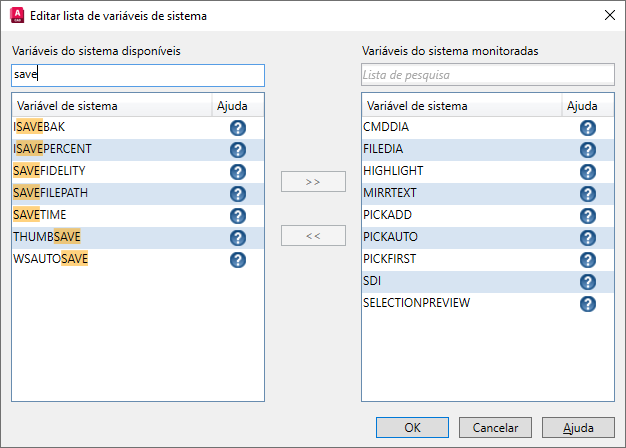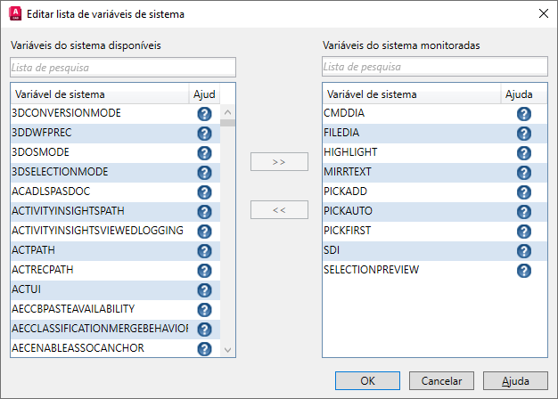 À esquerda, estão todas as variáveis de sistema disponíveis para o monitoramento. À direita, estão todas as variáveis de sistema que já estão sendo monitoradas. Clique no ? próximo ao nome de uma variável de sistema para abrir seu tópico de ajuda associado.