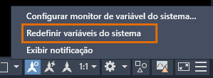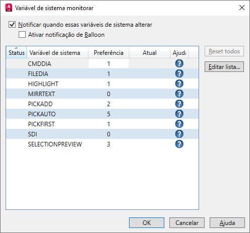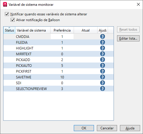 No prompt de comando, insira MONITORVARSISTEMA. Na caixa de diálogo Monitoramento de variáveis de sistema, é possível ver as variáveis de sistema que estão sendo monitoradas atualmente.
