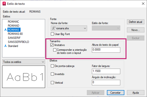 Os estilos de texto anotativo não são necessários para criar texto anotativo, mas eles ajudam a simplificar o processo de forma muito similar a seus equivalentes de estilo de texto não anotativo. A principal diferença entre os estilos de texto anotativo e não anotativo é a propriedade Anotativo. Quando a propriedade Anotativo está ativada e o estilo é atual, qualquer texto criado é anotativo. A propriedade Altura do texto do papel especifica a altura final do texto, enquanto a propriedade Corresponder a orientação do texto com o layout define se o texto é orientado de acordo com o layout e viewport em que é exibido.