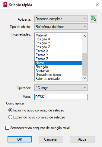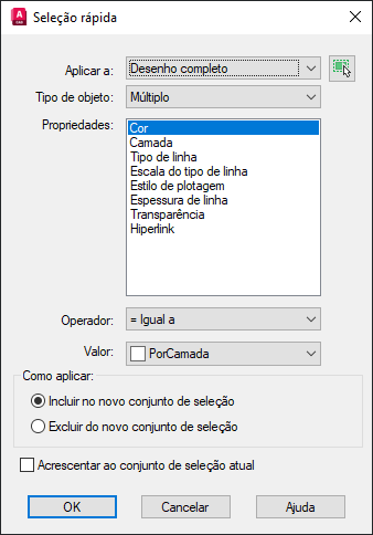 SELECIONARR. Cria um conjunto de seleção ao filtrar por tipo de objeto e propriedades.
