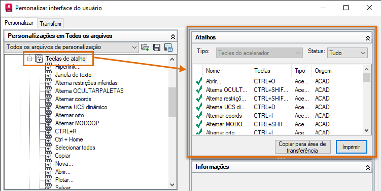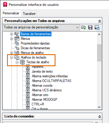 Para definir uma nova tecla de atalho, arrastaremos um comando da Lista de comandos para o nó Teclas de atalho e, em seguida, atribuiremos uma combinação de teclas a ele.