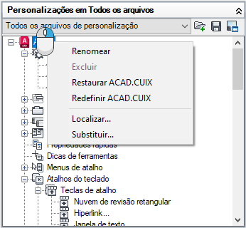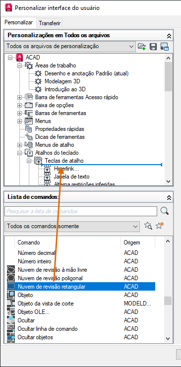 As teclas de atalho são definidas em um arquivo de personalização (CUIx). Neste exemplo, você definirá uma tecla de atalho para executar o comando NUVEMREV com a opção Retangular.