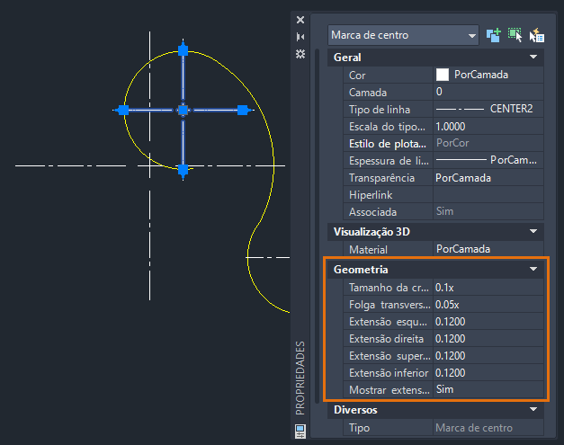 Vamos abordar como usar alças para modificar marcas de centro e linhas de centro mais adiante neste artigo: Editar com alças marcas de centro e linhas de centro.