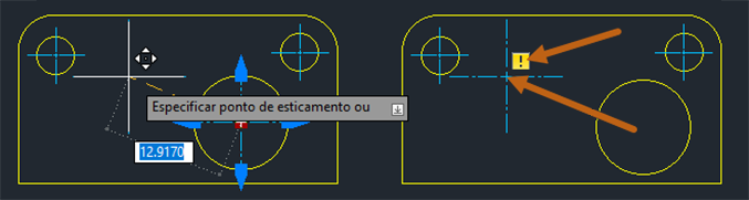 Mas se a marca de centro for movida para fora do círculo, a marca de centro ficará desassociada. Quando uma marca de centro não está associada a um objeto, um sinal amarelo é exibido indicando que está desassociada.