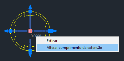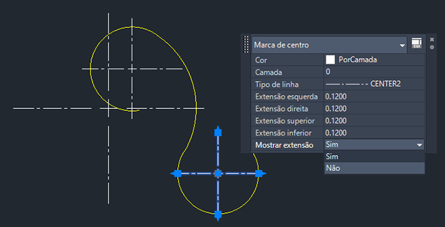 Se passar o cursor sobre a alça central multifuncional de uma marca de centro, será exibido um menu. Aqui, é possível esticar para mover a marca de centro e alterar uniformemente o comprimento de todas as quatro extensões de linha de centro.