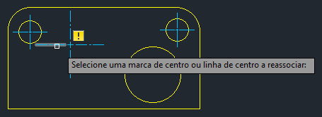 Se uma marca de centro ou linha de centro for desassociada de sua geometria, você terá algumas opções. Será possível excluir a marca de centro ou a linha de centro se não forem mais necessárias ou reassociá-las à geometria no desenho.
