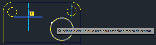 As marcas de centro e as linhas de centro têm algumas das mesmas propriedades associativas que as cotas. Elas podem ser desassociadas se a geometria que medem for excluída. Como uma cota, quando uma marca de centro ou linha de centro é desassociada e se o monitor de anotações estiver ativo, será exibido um sinal amarelo junto à marca de centro ou linha de centro.