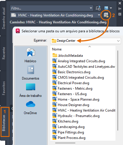 - Para escolher um desenho de biblioteca diferente na pasta DesignCenter, verifique que a guia Bibliotecas seja a atual (1) e clique no botão de navegação do arquivo (2).