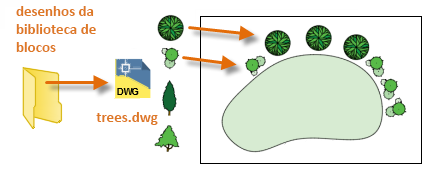 - Uma ou mais definições de bloco contidas em um arquivo de desenho. Por exemplo, é possível criar um desenho que contenha somente definições de bloco de árvores. Em seguida, é possível inserir qualquer um dos blocos desse desenho no desenho atual. Um arquivo de desenho que contém uma família de blocos relacionados é normalmente denominado de desenho da biblioteca de blocos.