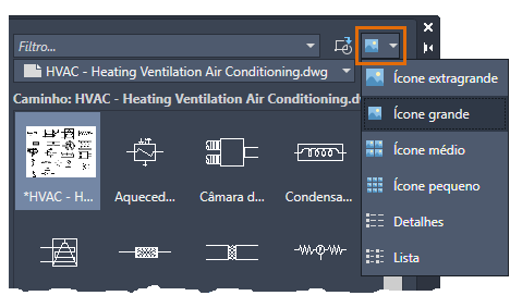 Nota: Na primeira vez que Blocos nas bibliotecas é clicado, uma caixa de diálogo de seleção de arquivo é aberta, na qual é possível selecionar um desenho inicial de biblioteca de blocos.
