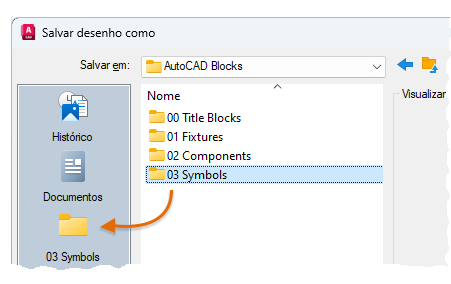 Dica: Quando você salvar desenhos para inserção posterior, navegue até uma pasta, clique com o botão direito do mouse e crie várias pastas para organizar os desenhos. É possível arrastar um ou mais deles para a barra de Locais para facilitar o acesso no futuro.