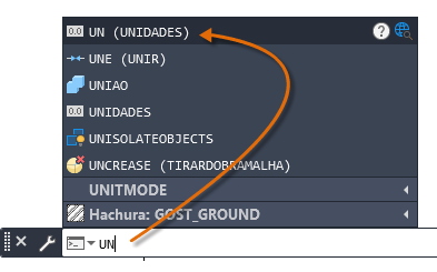 Observe que quando você começa a digitar um comando, ele é completado automaticamente. Quando há várias possibilidades disponíveis como no exemplo abaixo, é possível fazer sua escolha ao clicar ou utilizando as teclas de setas e pressionando Enter ou a barra de espaço.
