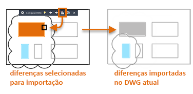 Na barra de ferramentas Comparar DWG, é possível importar as diferenças do desenho comparado para o desenho atual. Somente os objetos que são diferentes no desenho de comparação podem ser importados para o desenho atual.