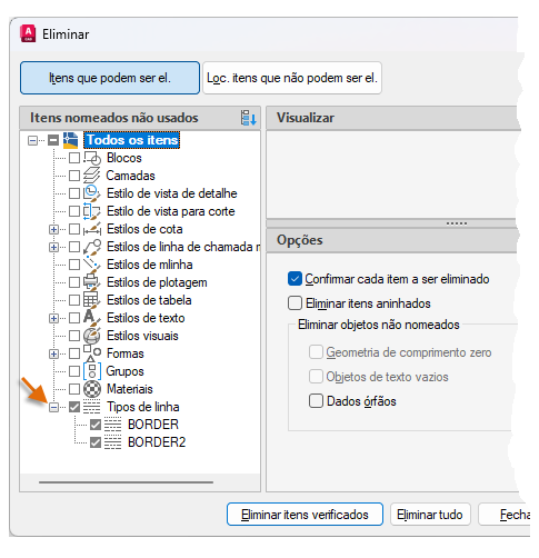 Use a caixa de diálogo Eliminar para excluir as definições não referenciadas, incluindo os tipos de linha, do desenho atual.