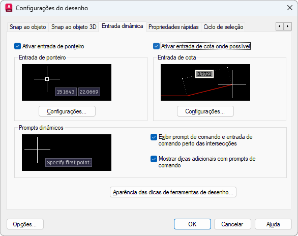 Controla a entrada de ponteiro, entrada de dimensão, entrada dinâmica e apresentação de dicas de ferramentas de desenho.