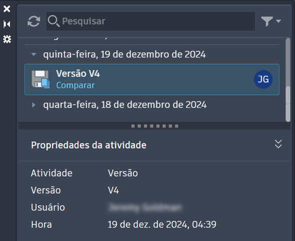 Quando você usa as Informações de atividade com um provedor de armazenamento na nuvem suportado, como o Autodesk Docs, o Google Drive, o OneDrive, o Box ou o Dropbox, uma nova versão de cada desenho é gravada cada vez que você salvar. Clique em Comparar em cada quadro de versão para comparar versões anteriores e atuais com facilidade.