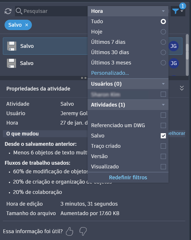 Ao selecionar Salvo no filtro Atividades, você pode isolar a atividade da versão. Para filtrar mais, use os filtros Tempo e Usuários.