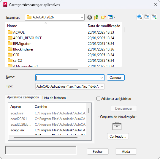 Se você selecionar um arquivo que já tenha sido carregado, Carregar recarregará o aplicativo quando aplicável. Você não poderá recarregar os aplicativos ObjectARX. Nesse caso, será necessário primeiro descarregar o aplicativo ObjectARX e, em seguida, carregá-lo novamente. A opção Carregar estará também disponível em um menu de atalho exibido ao clicar com o botão direito do mouse em um arquivo na guia Lista de histórico.