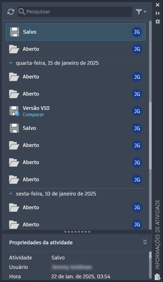 A paleta Informações de atividade registra as atualizações de cada colaborador em um arquivo de desenho, simplificando a colaboração e ajudando você a retomar de onde tiver parado.