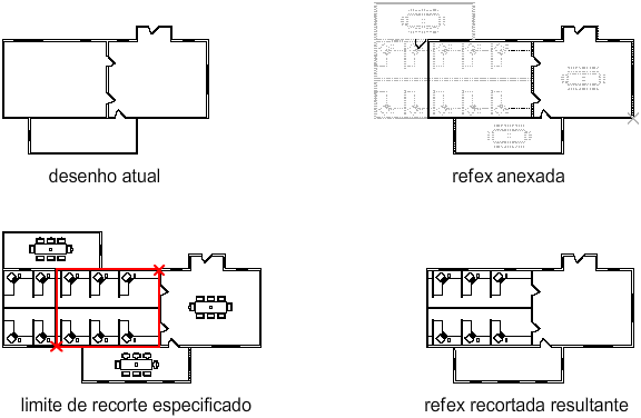 Depois que uma referência externa ou um bloco tiver sido cortada, ela pode ser movida, copiada ou rotacionada, da mesma forma que uma referência externa ou referência de bloco não cortada. O limite de corte se move com a referência. Se uma refex contém refex cortadas e aninhadas, elas aparecem cortadas no desenho. Se a refex pai for cortada, as refex aninhadas também serão cortadas.
