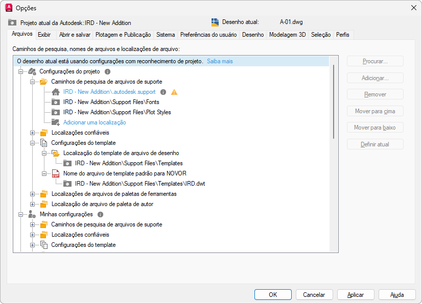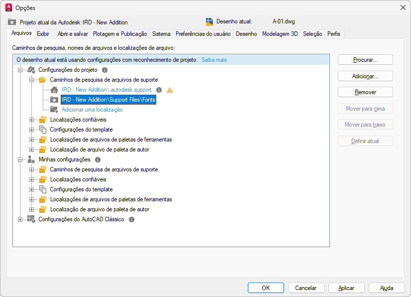 Depois que um projeto do Autodesk Docs tiver sido configurado para usar Arquivos de suporte conectados, será possível definir ou alterar os caminhos dessas configurações. Os caminhos são pesquisados na ordem em que são listados. Se o mesmo arquivo for encontrado em várias pastas, será usada a primeira instância encontrada. As configurações em Configurações do projeto têm precedência sobre Minhas configurações e, em seguida, Configurações do AutoCAD clássico.