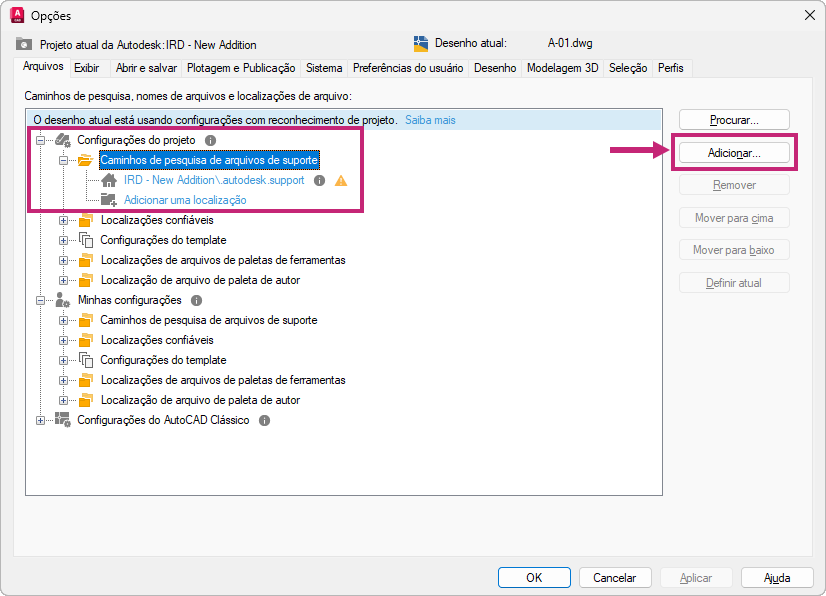 Importante: As configurações de caminho dos arquivos de suporte conectados só podem ser modificadas por membros de um projeto do Autodesk Docs com um nível de acesso de administrador de projeto.