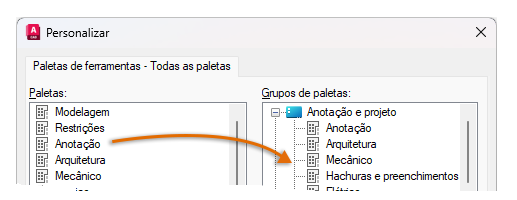 Para organizar e reduzir o número de paletas de ferramentas na janela Paletas de ferramentas, você pode definir e exibir grupos de paletas de ferramentas. Um grupo de paletas de ferramentas limita o número de paletas exibidas na janela Paletas de ferramentas. A opção Personalizar paletas fornece opções para criar e organizar grupos de paletas de ferramentas.