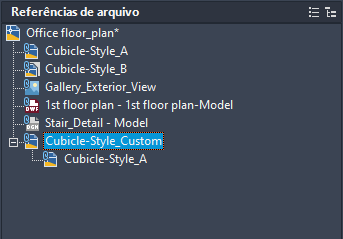 O nível mais alto da vista em árvore mostra o desenho atual. Arquivos referenciados aparecem no próximo nível. Arquivos referenciados que contêm suas próprias referências de arquivos aninhados podem ser abertos para mostrar níveis adicionais. Ao executar seleções na vista em árvore, apenas um arquivo referenciado pode ser selecionado de cada vez.