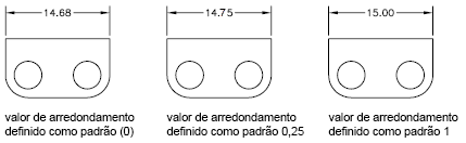 Você pode arredondar todos os valores de cota, exceto os valores das cotas angulares. Por exemplo, se você especificar um valor de arredondamento de 0.25, todas as distâncias serão arredondadas para a unidade mais próxima de 0.25. O número de dígitos exibidos depois da vírgula decimal depende da precisão definida para as unidades primária e alternativa e para os valores de tolerância lateral.