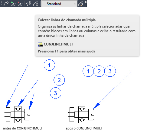Objetos de linha de chamada múltipla com blocos como conteúdo podem ser coletados e anexados à uma linha de patamar. Usando o comando CONJLINCHMULT, as linhas de chamada múltipla podem ser coletadas horizontalmente, verticalmente ou dentro de uma área especificada, dependendo de suas necessidades de desenho.