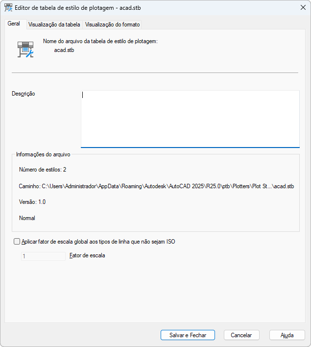 Relaciona nome, descrição, número da versão, localização (nome do caminho) e tipo de tabela do arquivo da tabela de estilos de plotagem.